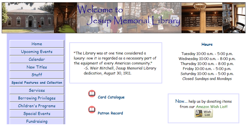 I created Jesup Memorial Library’s first website in 2004 and maintained it through 2013, using a MySQL backend.